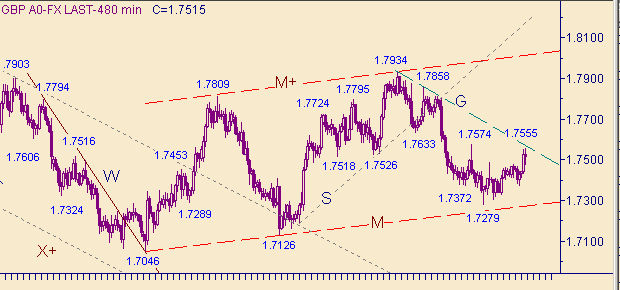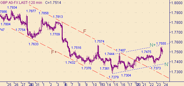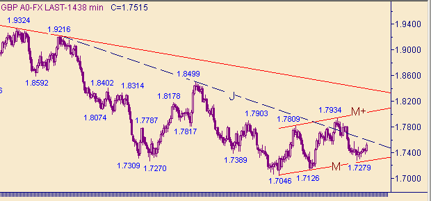 Находимся в процессе формирования второй восходящей ветки канала N-N+ на рис. 3. При этом, первая ветка - 1.7279(14/02/06)-1.7487(15/02/06); предполагаем, что вторая ветка началась от 1.7304(16/02/06) (см. на рис. 3). Но не забываем про нисходящее движение с началом от 1.7934(25/01/06) - на рис. 2 видим, что текущее положение линии тренда этого down-движения совпадает с сегодняшним максимумом, равным 1.7555. Праздничная встреча линии G на рис. 2 и канала N-N+ на рис. 3. Вторая ветка в канале N-N+ на рис. 3 пока не выглядит законченной - не хватает ещё одного небольшого up-тренда. Задержка приключилась на уровне 1.7555 вблизи которого находится уровень (равен 1.7544) равенства длин двух составляющих движений: первое движение - 1.7304(16/02/06)-1.7475(21/02/06); второе началось от 1.7373(22/02/05).