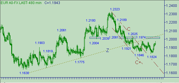 Наблюдаем в мониторе как евро/доллар штурмуют область вблизи 1.2000. Важным является даже не сам уровень 1.2000, а ценовой интервал 1.2000-1.2030 - на рис. 2 он обозначен сереньким узким прямоугольником. Кстати, текущее положение линии Z на рис. 2 соответствует значению курса 1.2030.