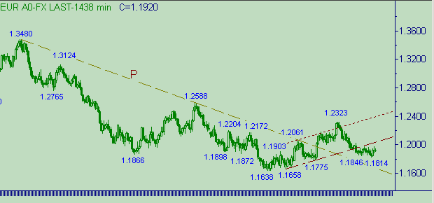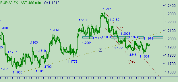 Вариантов для возможной работы два. Первый: в случае снижения курса до 1.1870 открывать позицию на покупку с целевой областью вблизи 1.2000. Второй: в случае роста курса до 1.2000 открывать позицию на продажу с целевой областью 1.1880.Первый вариант пропускаем. Второй - почти пропускаем, точнее призадумываемся над его возможным осуществлением. В случае роста курса до области 1.2000 будем искать дополнительные вспомогательные индикативные сигналы и в случае их обнаружения будем принимать смелые (или не смелые) решения. Сейчас - вне рынка.