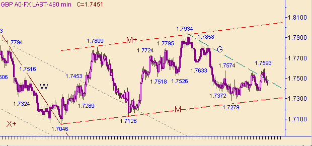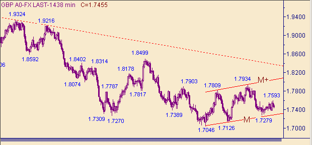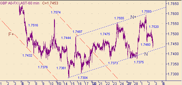 Сейчас рынок формирует коррекцию от роста курса 1.7375(28/02/06)-1.7593(01/03/06), который является третьей восходящей веткой в канале N-N+ на рис. 3. Целевая область для этой коррекции - вблизи уровня 1.7390.