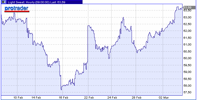 Нефть снова активно дорожает - на сессии в четверг апрельские фьючерсы на WTI подорожали $1.39 до $63.36 за баррель. Таким образом, всего лишь за три дня цены взлетели на $2.36. Опасения инвесторов в отношении геополитической напряженности продолжают расти, несмотря на рост запасов в США. "Пока не спадет напряжение в мире цены будут расти, несмотря на остальные позитивные факторы. На будущей неделе мы ждем продолжение роста цен на нефть," - отметил Марк Уаггонер из Excel Futures.