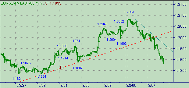 Для нисходящего движения с началом от 1.2093(06/03/06) важной областью поддержки определяем ценовой интервал 1.1875-1.1885. Это раз. Следующая поддержка вблизи уровня 1.1825. Это два. Это самое два можно и нужно расширить до неприлично широкого ценного интервала 1.1784-1.1825. Далее технически-симпатично смотрится интервал 1.1595-1.1635, так же неприлично-широкого размера. Это три. Пока хватит. Если требуется альтернатива в виде трех областей сопротивления, то на данный момент ближайшие ценовые области: 1.1990, 1.2025, 1.2090. Согласны, что очень уж простенько мы отнеслись в выборе уровней сопротивления, но пока другие области не выделяются.