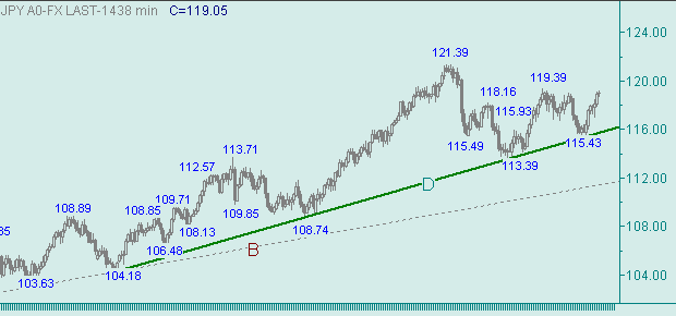 Доллар/Йена пытаются обозначить третью восходящую ветку в up-движении вдоль линии D на рис. 1: первая ветка - 104.18(04/05/05)-113.71(20/07/05); вторая - 108.74(05/09/05)-121.39(05/12/05); предполагаем, что третья ветка началась от 113.39(12/01/06). Технические целевые области для up-движения рассматриваем вблизи следующих уровней: 119.90, 120.40, 121.00, 121.40, 122.90, 124.15, 125.40, 126.30. Сама третья ветка состоит из трех движений: первое движение - 112.39(12/01/06)-115.93(17/01/06); второе - 114.12(23/01/06)-119.39(03/02/06); предполагаем, что третье движение началось от 115.43(01/03/06). Это третье движение на рис. 3 обозначено каналом L-L+. Рынок восходящим движением вдоль линии F на рис. 3 пытается завершить восхождение в канале L-L+.