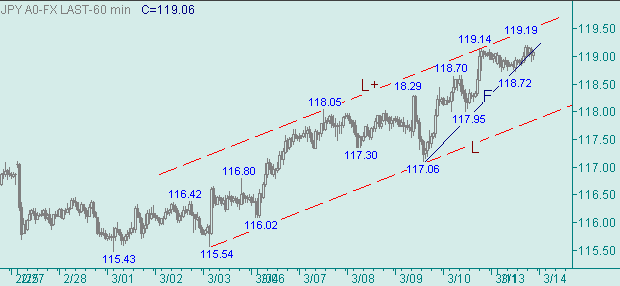 В случае down-отката от области вблизи 119.20 будем рассматривать этого откат как формирование коррекции от роста курса в канале L-L+ (см. на рис. 3). В этом случае ищем локальное дно, которое будем началом очередного Up-поддвижения в восхождении с началом от 115.43. Структура этого восхождения: первое восходящее движение - 115.43(01/03/06)-116.42(02/03/06); второе на рис. 3 обозначено каналом L-L+. Будем искать возможное начало возможной третьей ветки. Для нисходящего движения важные уровни: 118.70, 118.30, 117.05.