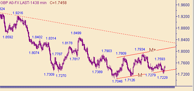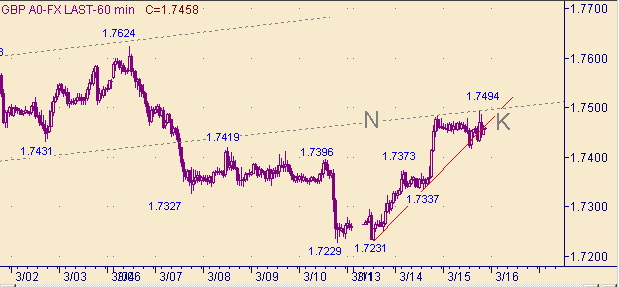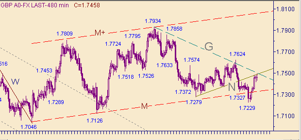 Здесь так же тестируется важный уровень 1.7500. Рынок пытается определиться с окончанием восходящего движения вдоль линии K на рис. 3. Целевой уровень рассматриваем на 1.7480. Вблизи 1.7500 максимально-информативно-критериальный уровень можно рассматривать на 1.7515. На рис. 2 видим, что рынок "уперся" сегодняшним максимумом, равным 1.7494 в точку пересечения линий G и N.
