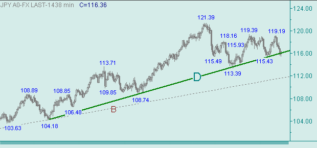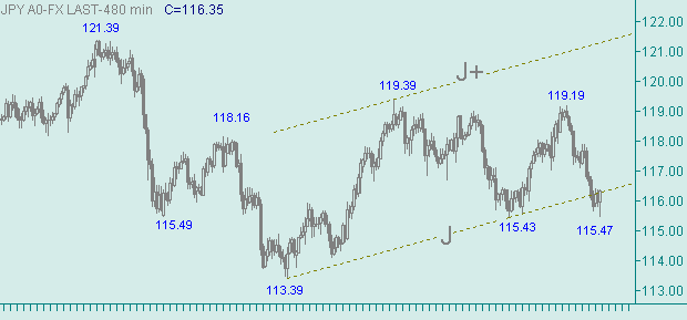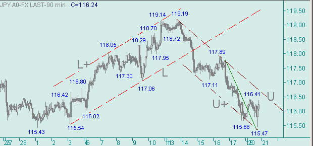 Сегодняшнее нисходящее движение между дневным максимумом и минимумом, равными соответственно 116.41 и 115.47, более подходит под понятие "достижение технической цели в рамках коррекции", чем на "продолжение нисходящего движения". Дневной максимум последнего торгового дня, равный 115.68, не попадал на технические цели, которые находились на 115.80 и 115.40. Теперь цель достигнута, но важно то, что курс не опустился ниже уровня начала восходящего движения в рамках канала L-L+ на рис. 3.