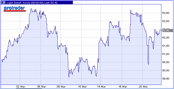 Цены на нефть немного выросли во вторник на фоне роста цен на бензин и мазут. Апрельские фьючерсы на WTI выросли на 15 центов до $60.57 за баррель (истекли вчера). Фьючерсы на WTI на май выросли на 38 центов до $62.34 за баррель. Сегодня в 18.30 мск. будут опубликованы данные по нефтезапасам на 17 марта, по мнению экспертов, стоит ждать рост запасов, что может привести к снижению нефтяных котировок. Аналитики прогнозируют рост запасов нефти на 2.5 млн. барр.