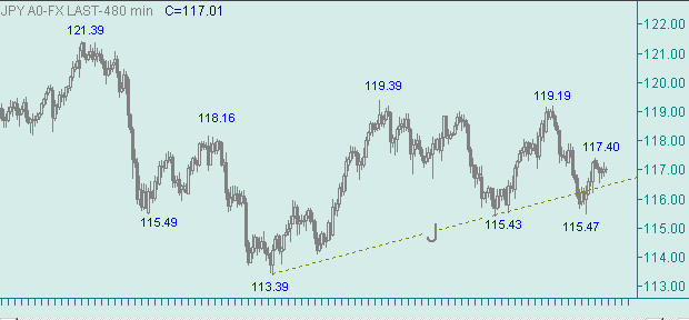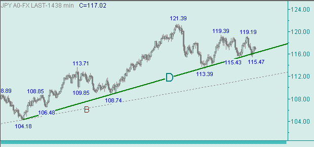 Курс доллар/Йена завис над уровнем 116.55. Действительно, момент очень важный. В случае выхода курса выше 117.40 на графиках обозначится третья восходящая ветка в up-движении с началом от 115.47(20/03/06): первая ветка - 115.47(20/03/06)-116.92(21/03/06); вторая - 116.21(21/03/06)-117.40(22/03/06). В этом случае ближайшие технические цели для восхождения рассматриваем вблизи следующих ценовых значений: 118.10, 118.45, 119.00. В случае же нисходящего продолжения оставляем в силе вчерашний список потенциальных целей: 116.60, 116.00, 115.50, 114.45, 114.05, 113.70.