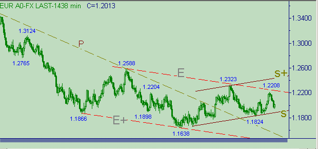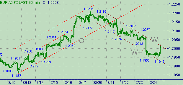 Сейчас рынок пытается изобразить коррекция от снижения в канале W-W+ на рис. 3 с перспективами перехода в Up-движение, которое можно будет квалифицировать (в случае выхода выше 1.2230) как третью восходящую ветку в росте курса вдоль линии Q на рис. 2. Если рассуждать по хозяйски, то подтверждением факта коррекции будет выход курса выше 1.2110. Но здесь весь юмор ситуации заключается в том, что на уровне 1.2110 курс евро/доллар пройдет от 1.1949 путь длиной в 61.8% от снижения в канале W-W+ на рис. 3. Вот и думай..