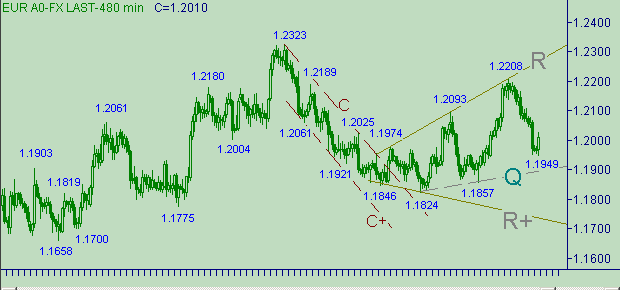 Кстати, наконец то вспоминаем про существование рис. 2 и гладя на него видим две актуальные линии: Q и R+. Первая обозначает восходящее движение с началом от 1.1824(27/02/06), а вторая обозначает нам границы расходящегося треугольника R-R+ на рис. 2. Актуальность расходящегося треугольника со временем уже потеряна, но пока оставим эти линии на графике - мало ли что.