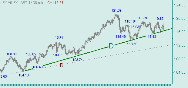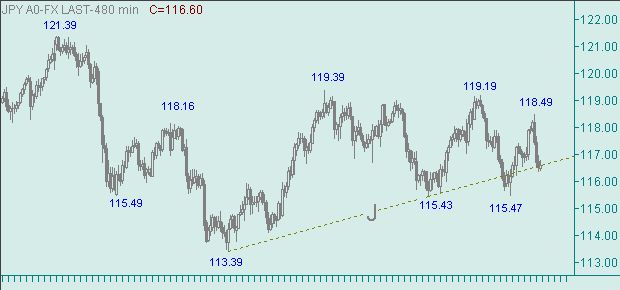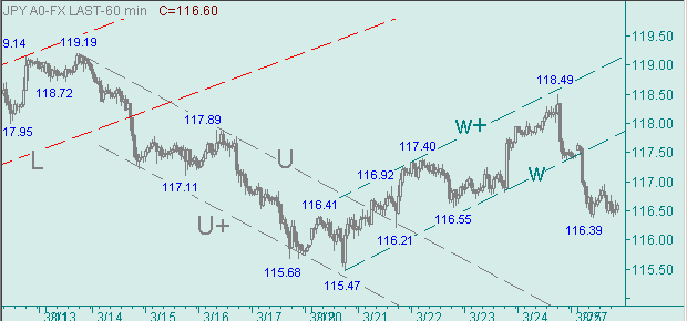 Сейчас сложно утверждать закончилось ли нисходящее движение с началом от 118.49(24/03/06) или нет. Критерий окончания движения - выход курса выше 117.66. Если рассматривать перспективы постановки позиции на продажу, то здесь имеем следующий план: в случае роста курса до 117.15 открывать позицию на продажу, стоп-лосс - выше 117.66, цель - 115.80. Нам более симпатичен другой вариант: в случае снижения курса до 115.80 искать счастья в открытии позиции на покупку, стоп-лосс - 115.39, цель - 117.35. При решении об открытии позиции необходимо иметь технические подтверждения, например структура снижения или вспомогательные индикативные функции. Вот в этих двух направлениях и будем работать.