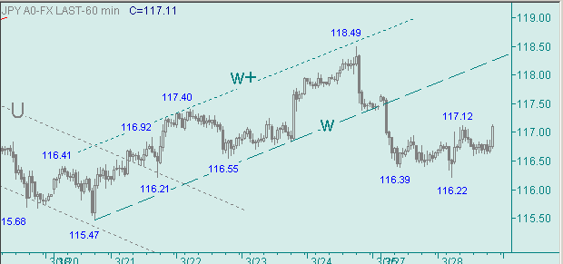 Доллар/Йена сегодня ночью убедительно опустились до целевой области 116.15-116.25. Предполагаем, что от сегодняшнего минимума, равного 116.22 началась коррекция от снижения курса 118.49(24/03/06)-116.22(28/03/06). Целевые области для коррекции: 117.45, 118.00, 118.40. Текущее положение линии W на рис. 3 соответствует значению курса 118.25. А что можем ожидать далее? Далее ожидаем попыток "Медведей" от обозначенных уровней сформировать очередную нисходящую ветку, аналогичную ветки 118.49(24/03/06)-116.22(28/03/06).