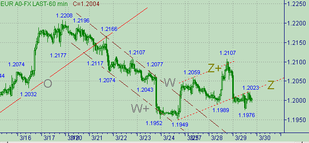 А пока, сегодняшний минимум, равный 1.1976, всего на 1п. опустился ниже уровня, на котором длина нисходящего движения с началом вчерашнего максимума, равного 1.2107, составляет 50% от длины 1.2208(17/03/06)-1.1949(24/03/06) (канал W-W+ на рис. 3).
