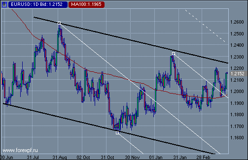 Техническая картина на дневном графике евро/доллар выглядит удручающей для роста американской валюте в краткосрочной перспективе (горизонт порядка двух-трех недель). Мы можем заметить, что цены начали восходящее движение, оттолкнувшись от 100-дневной скользящей средней линии, протестировав ее в качестве поддержки. Ранее курс пары пробил верхнюю линию вил Эндрюса и при попытке вернуться (пробить линию сверху вниз) потерпел неудачу. С точки зрения классического технического анализа, построенного на вилах Эндрюса (прим. forexpf.ru - мы неоднократно упоминали о том, что любим их использовать в паре евро/доллар, поскольку за последние несколько лет они великолепно подтверждали свою эффективность), теперь курс евро/доллар должен совершить ход, равный по размеру расстоянию между верхней линией вил Эндрюса и их медианой. Это в грубом приближении уровень 1.2400. Однако сильным сопротивлением будет верхняя черная линия нисходящего канала, текущее значение которой находится на 1.2250. Следовательно, можно рассчитывать цели выше этой линии, но ниже отмерянного хода по вилам Эндрюса. С учетом предыдущих максимумов на 1.2320, мы могли бы посоветовать определять цель в диапазоне 1.2320/1.2350. Теперь сделаем важное замечание. Вышеописанный пессимистичный (подчеркнуто с технической точки зрения) для доллара сценарий вступает в силу в том случае, если сегодня, ровно как и текущую неделю, курс евро/доллар завершит выше 1.2150. Михаил Шульгин