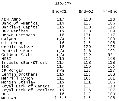 Представляем Вашему вниманию сводную таблицу прогнозов курса американского доллара к японской йене от ведущих банков и инвестиционных домов. Данные опубликованы по состоянию на 3 апреля 2006 года. ProFinance.Ru - Forex News / Новости Форекс