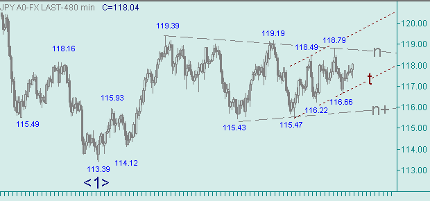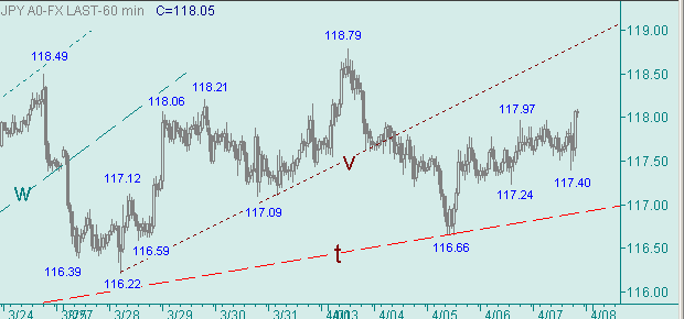 Изменений не много, в разряд заметных событий заносим тот факт. Что рост курса с началом от 1116.66(5/04/06) выходит за рамки модели коррекции от роста курса вдоль линии v на рис. 3. Сейчас ближайшие технические целевые уровни: 118.10, 118.35, 118.65. В наших рассуждениях так же мало изменений и все вчерашние предположения остаются в силе.
