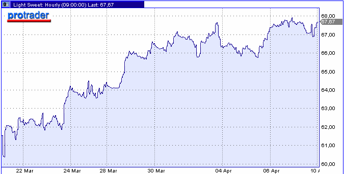 Нефтяное ралли продолжается - сегодня утром майские фьючерсы на нефть WTI на электронной сессии подобрались к отметке $68 за баррель, максимум был достигнут в районе $67.85 за баррель. Рост проходит на фоне повышения напряженности вокруг Ирана и Нигерии. Согласно данным американских СМИ, администрация США готовит план возможного военного удара по Ирану. "Рынок в последнее время забыл о геополитических угрозах и стал слишком спокойным", - пишут сегодня аналитики Commonwealth Bank of Australia. В пятницу нефть подешевела на на $0.55 до $67.39 за баррель, при этом в ходе торгов была достигнута отметка в $66.65 за баррель.