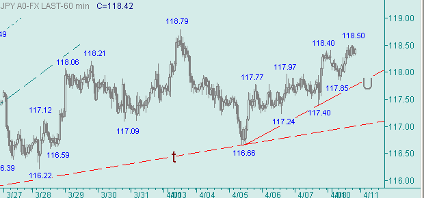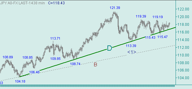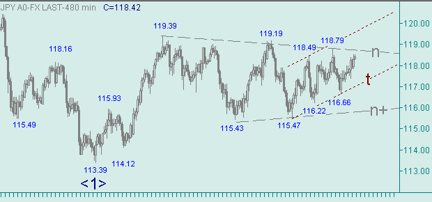 На рис. 2 и 3 видим, что курс доллар/йена остается между линиями n и n+, но пытается продвигаться вдоль линии t. Сейчас рынок пытается сформировать третью восходящую ветку в росте вдоль линии t. Этот рост курса важен, т.к. он является составляющей частью up-движения с началом 113.39(12/01/06), которое, в свою очередь, может стать в перспективе третьей восходящей веткой в движении вдоль линии D на рис. 1. Перспективные технические цели для восходящего движения вдоль линии t на рис. 2 и 3: 118.45-118.50, 118.85-119.10, 119.45-119.60, 120.25-120.35, 120.85-121.00, 121.40-121.60.