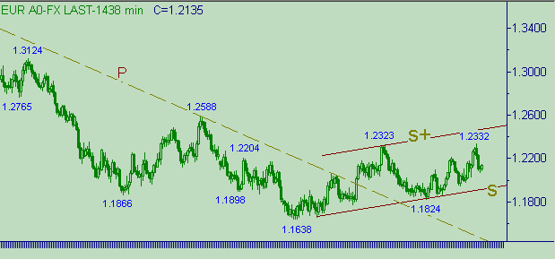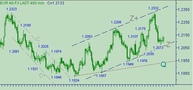 Два возможных варианта для постановки позиции в модели формирования коррекции от снижения в канале b-b+ на рис. 3. Первый - в случае роста курса до уровня 1.2160 открывать позицию на продажу, стоп-лосс - 1.2187 (ставить его выше 1.2224 не разумно), цель - 1.2010. Эта позиция ставится в предположении продолжения down-движения, используя приметные уровни противоположной модели изменения курса, в модели коррекции от снижения в канале b-b+ на рис. 3, и предполагает активную работу с переносом стоп-лоссов при достижении курсом приметных уровней поддержки. Проблемы этого варианта - нам более глянется модель коррекции от канала b-b+ на рис. 3, что само по себе противоречит постановки. Плюсы позиции - приметные уровни очень даже симпатично расположены и позволяют использовать две разные модели для открытия позиции и продвижения стоп-лоссов.