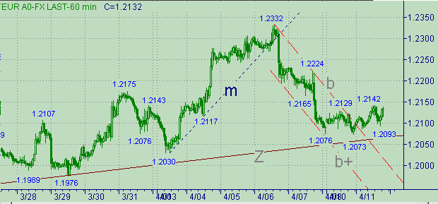 Курс евро/доллар уже вышел выше линии b на рис. 3. Для этого слегка восходящего движения важные уровни сопротивления рассматриваем вблизи уровней 1.2165, 1.2225. Первый из этих уровней - просто ближайшая цель для коррекционной формации с началом от вчерашнего минимума, равного 1.2073. Второй - так же цель для коррекции, но и является критериальным уровнем, ответственный за сигнал об окончании снижения с началом от 1.2332(6/04/06) (выход курса выше 1.2225 - окончание down-тренда). Для самого нисходящего движения, обозначенного на рис. 3 каналом b-b+, остается вчерашняя проблема - минимальное значение курса , равное 1.2073, не попадает близко к техническим целевым уровням. Справедливости ради отметим, что во-первых - никто не обещал все как up так и down движения заканчивать на симпатичных для нас уровнях, а во вторых - график курса евро/доллар на рис. 3 всего 15п. не дошел до линии Z, которую можно рассматривать как цель. В качестве технических целевых областей для down-движения остается всё тот список интервалов: 1.2050-1.2060, 1.2000, 1.1970, 1.1890.
