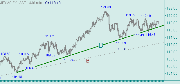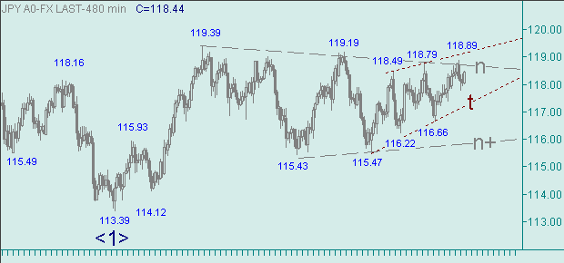 Рабочая модель - коррекция от роста курса вдоль линию E на рис. 3. Очертания возможного торгового плана: открывать позицию на продажу в ценовом интервале 118.50-118.90, стоп-лосс определять на уровень 119.14, цель - 117.50. Проблемы этого торгового плана: в случае открытия позиции от нижней границы интервала 118.50-118.90 получаем большой размер стоп-лосса; в случае выхода курса выше 117.60 нарушается гармония коррекционной модели от роста курса вдоль линию E на рис. 3. Поэтому не будем конкретизировать открытие или ен открытие позиции - каждый сам решит удобно он будет чувствовать в рынке или нет. Мы же сами пропускаем позицию по проблемам, изложенным выше.