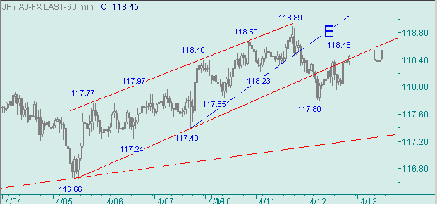 Находимся в процессе коррекции от роста курса 117.40(7/04/06)-118.89(11/04/06) (движение вдоль линии E на рис. 3). В перспективе переход в модель коррекции от роста курса 116.66(5/04/06)-118.89(11/04/06) (движение вдоль линии U на рис. 3), ещё в перспективе - в коррекционную формацию от роста курса 115.47(20/03/06)-118.89(11/04/06) (рост курса вдоль линии t на рис. 2), а более далекой перспективе - в модель продолжения восходящего движения с началом от 113.39(12/01/06). Понятно, что чем более далекой является перспектива тем меньше вероятность перехода в модель соответствующую этой перспективе.