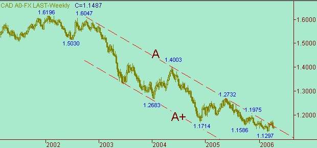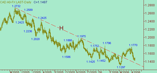 Если предполагать коррекционную модель, то на рис. 2 видим, что первая часть этой формации составляет рост курса 1.1297(2/03/06)-1.1770(3/04/06) длиной 473п. Далее имеем нисходящее движение 1.1770(3/04/06)-1.1425(12/04/06) длиной 345п. (представлено на рис. 4). Сейчас же рынок пытается сформировать коррекцию от снижения курса 1.1770(3/04/06)-1.1425(12/04/06). Технические целевые области для этой коррекции: 1.1475, 1.1500, 1.1550.
