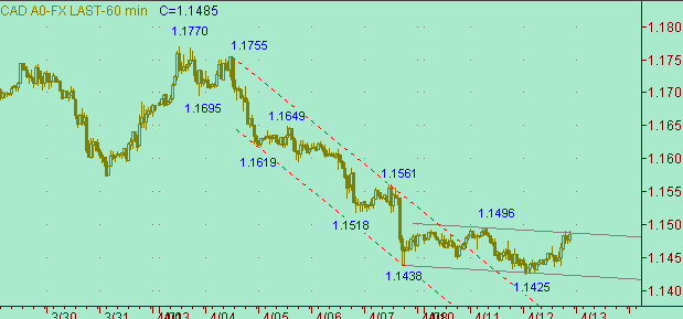 Имеем рабочую модель (коррекция от снижения 1.1770(3/04/06)-1.1425(12/04/06) на рис. 4). Далее пытаемся разглядеть удобные моменты для постановки позиции в этой модели. Более конкретно пока не можем изложить суть вопроса постановки позиции. Ищем пути и удобное время - вне рынка.