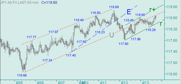 Доллар/Йена подозрительно не двигаются вниз, очень даже бодренько продвигаются к области вблизи уровня 119.00 - от вчерашнего минимума, равного 117.80, сформирован восходящий канал r-r+ на рис. 3. Всем эти события происходят выше линии t и ниже линии n на рис. 2.