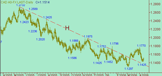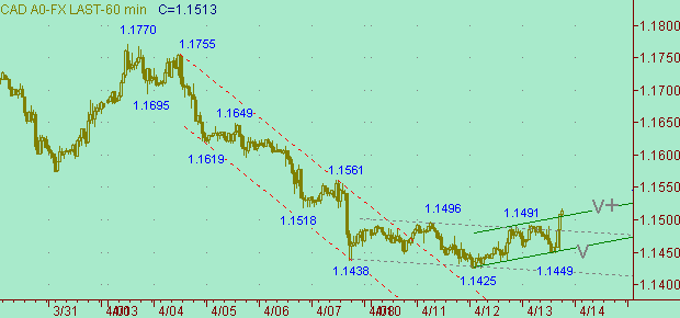 На рис. 3 видим развитие коррекционного процесса - канал v-v+. Напомним, что ожидаем формирования коррекции от снижения курса 1.1770(3/04/06)-1.1425(12/04/06). Целевую область для этой коррекции рассматриваем вблизи уровня 1.1600. Сам канал v-v+ рассматриваем как первую часть коррекционной формации.
