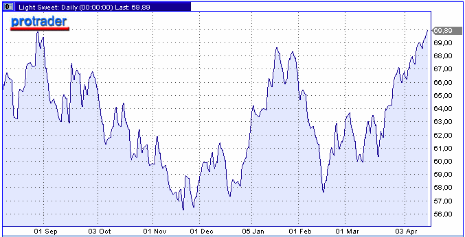 Нефтяное ралли продолжается - сегодня котировки на нефть WTI на электронных торгах на Nymex достигли уровня в $70 за баррель, что произошло впервые с августа прошлого года, когда нефть росла после разрушительных последствий урагана "Катрина". Теперь цены находятся в непосредственной близости от исторического максимума в $70.85 за баррель. Ралли нефти ускоряется на фоне геополитических проблем. Инвесторы опасаются перебоев в нефтедобыче в Нигерии и возможного прекращения поставок нефти из Ирана. Exxon Mobil обсуждает с правительством Чада его требование выплатить компенсацию в размере $100 млн., эта новость также принесла беспокойство на рынок. Власти Чада (добыча нефти составляет 160.000-170.000 б/с) пригрозили запретить добычу, если ко вторнику не будет достигнуто соглашение.