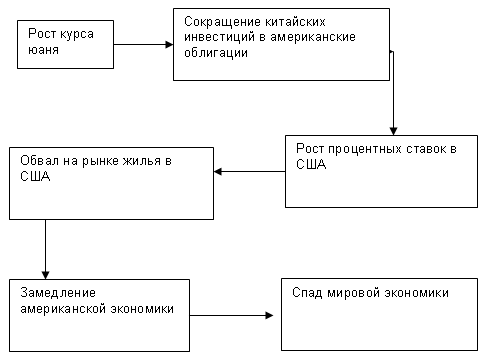 Так, ослабление доллара приведет к тому, что китайские инвесторы перестанут вкладывать свои деньги в американские активы. Чтобы повысить их привлекательность и привлечь новые источники финансирования для своих дефицитов, ФРС будет вынужден поднимать ставку. Это, в свою очередь приведет к резкому снижению активности на рынке жилья, который уже демонстрирует признаки охлаждения. А, с учетом того, что большая часть потребительских расходов сконцентрирована именно в этом секторе, экономику США ждут тяжелые последствия. В свою очередь, если "локомотив мировой экономики" вдруг остановится, или даст задний ход, весь состав позади него полетит под откос. Возможно, экономисты со свойственным им пессимизмом несколько сгущают краски, однако, эти рассуждения все же не лишены логики.