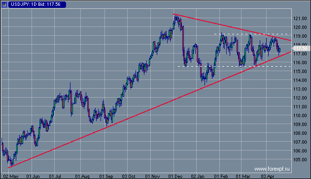 В любом случае, техническая картина нам не позволяет делать каких-либо уверенных выводов о том, в какую сторону может произойти выход из треугольника. Если оценивать факторы, которые сейчас или в ближайшее время могут вызвать сильные ценовые колебания японской валюты, то их не много на самом деле. Не стоит обольщаться на тему процентных ставок Банка Японии. Это перспектива не для возраста нашего треугольника. Факторов три: ситуация вокруг визита главы Китая в США и разговоры о ревальвации юаня, высокие цены на нефть и их крайне негативное влияние на экспортно-ориентированную японскую экономику и carry trade. Понятно, что фактор номер один позитивен для йены и является надеждой нижней границы треугольника. Carry trade играет в пользу силы йены на возрастающих ожиданиях повышения ставок в Японии. Об этом мы уже говорили. Тем более что, апрель - первый месяц наступившего финансового года в Стране восходящего солнца. Месяц размещения средств японских инвесторов в иностранные активы. В итоге совокупная картина вещей такова, что преодоление верхней границы треугольника и взлет к 122 пока более вероятен, нежели обратно-пропорциональное развитие ситуации. Михаил Шульгин ProFinance.Ru - Forex News / Новости Форекс