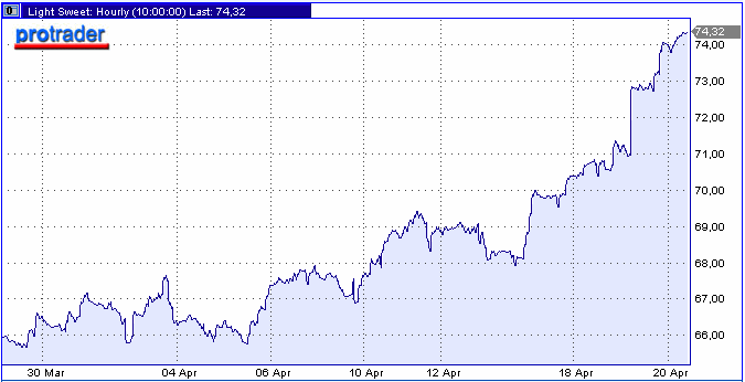 Нефтяное ралли продолжается на фоне данных, показавших снижение нефтезапасов в США. Запасы нефти в за неделю, завершившуюся 14 апреля, сократились на 800.000 барр. до 345.2 млн. барр. Запасы бензина сократились на 5.4 млн. барр. до 202.5 млн. барр. Запасы дистиллятов снизились на 2.8 млн. барр. до 114.6 млн. барр. Аналитики ожидали снижение запасов бензина на минувшей неделе на 2.5 млн. барр. Сегодня утром июньские фьючерсы на нефть WTI торгуются в районе $74.30 за баррель. Майские фьючерсы на нефть марки WTI торгуются в районе $72.30. По итогам сессии в среду контракты подорожали на 1.2% до нового рекорда $72.17, при этом в ходе торгов был достигнут уровень $72.40. По мнению главы Управления энергетической информации (EIA) Гая Карузо, текущее ралли цен на нефть не является спекулятивным. "Движение рынка задают фундаментальные показатели, такие как поставка и спрос. Это не спекулятивный пузырь", - сказал он.