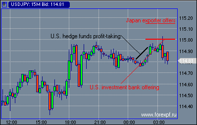 На азиатских торгах доллар пытается возобновить рост против евро и йены. Более существенны его достижения в паре против японской валюты. Курс доллар/йена проверил на прочность отметку 115.00, что стало отражением частичной фиксации удерживаемых хеджевыми фондами коротких позиций. Однако, протестировав максимум на 115.03, курс резко был отброшен назад к 114.80. На фигуре 115.00 активировал агрессивные продажи один из американских инвестиционных банков. Именно его офера и отбросили доллар. Дилеры высказывают предположение, что этот инвестиционный банк защищает уровень 115.00 по поручению Центробанка одной из азиатских стран. Выше фигуры, в области 115.15/45 свои офера выстроили японские экспортеры. Существенные стопы могут быть замечены лишь выше 115.60. ProFinance.Ru - Forex News / Новости Форекс