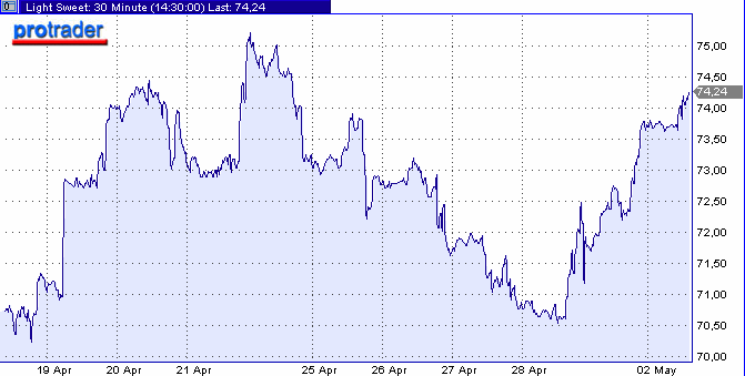 Цены на нефть преодолели планку в $74 за баррель на европейских торгах во вторник, продолжив подъем с предыдущей сессии. Участники рынка, опрошенные Reuters, объясняют настрой рынка опасениями по поводу поставок и спросом на "черное золото" со стороны фондов. "Все то же самое. Новых новостей нет, - сказал один из трейдеров. - По существу, рынок должен быть гораздо ниже". Как пишет Bloomberg, цены растут из-за опасений по поводу стабильности поставок сырья из Ирана. США и их союзники оказывают давление на Совет Безопасности ООН с целью принятия мер в отношении Тегерана. 28 апреля МАГАТЭ в своем докладе Совету управляющих этой организации и СБ ООН констатировала невыполнение Ираном рекомендаций Совбеза ООН по прекращению обогащения урана. В понедельник стоимость нефть увеличилась более чем на $1,80 за баррель после новостей о пожаре на итальянском НПЗ на Сицилии, мощность которого составляет 160.000 баррелей в сутки. Кроме того, в Нигерии - крупном экспортере сырья, простаивает порядка четверти производства нефти из-за диверсий боевиков.