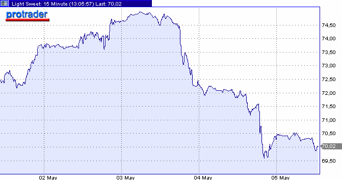 Обвальное падение цен на "черное золото" продолжается вот уже третий день подряд. Сейчас на европейских торгах цены на американскую нефть пока не совсем успешно пытаются вернуться выше психологического уровня в $70. Аналитики связывают причины обвала с начавшейся фиксацией прибыли хеджфондами после выхода данных о росте запасов бензина в США. Как сообщило в среду Управление энергетической информации, запасы бензина в США за неделю, завершившуюся 28 апреля, выросли на 2.1 миллиона баррелей до 202.7 миллиона. При этом аналитики, опрошенные Reuters, ожидали снижение запасов бензина на минувшей неделе на 700.000 баррелей. Цены за последние две сессии рухнули на 6.5 %, значительно отойдя от исторического максимума в $75.35, достигнутого две недели назад. Помимо этого, на этой неделе были опубликованы данные, показавшие падение автопродаж в США, а также изменение предпочтений американцев в пользу малолитражных автомобилей. Однако иранская проблема еще не исчерпала себя, и, если на эту страну действительно будут наложены санкции Совбезом ООН, цены на нефть вернутся к историческим пикам. К 12.58 мск июньские фьючерсы на североморскую нефть Brent составляют $70.15. Аналогичные контракты на американскую легкую нефть котируются по $70.01 за баррель.