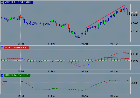 Лес Кастелл из G7forex.com в своих оценках перспектив курса AUD/USD отмечает сильный технический сигнал в виде медвежьей дивергенции, сформированный гистограммой MACD дневного графика, который дополняется продолжительным нахождением дневного медленного стохастика в области перекупленности. Все это в совокупности позволяет предполагать дальнейшее продолжение корректирующего снижения, считает эксперт. Кастелл добавляет, что мы уже видели падение курса в 200 пунктов от максимумов, ломающих 7 недельное повышение. В результате этого коррекционного снижения осцилляторы часового графика опустились до области перепроданности. Пока снижение курса сдерживается поддержкой $0.7605-$0.7595, возможен рост до $0.7690. Если курс не сможет выйти выше уровня оукончания первой нисходящей волны на $0.7700, то мы ожидаем продолжение снижения, добавляет Кастелл, предполагая прорыв ниже $0.7595. В этом случае наиболее вероятной следующей целью выглядит диапазон $0.7555/45. ProFinance.Ru - Forex News / Новости Форекс