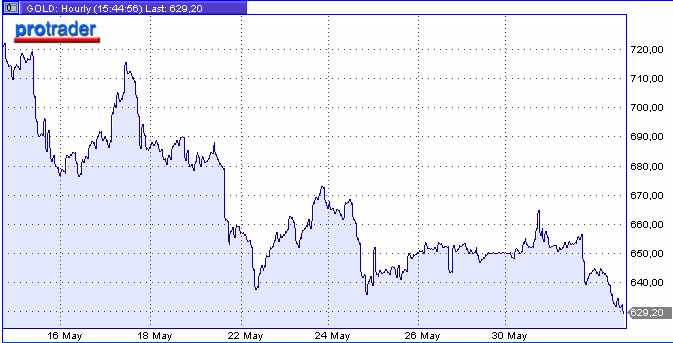 Нисходящая динамика цен на золото возобновилась в четверг и сопровождалась достижением новых минимумов. Котировки в Лондоне в четверг потеряли более 2 %. Основной причиной падения драгметалла участники рынка называют рост курса доллара. При этом вслед за золотом последовали другие драгоценные металлы. Стоимость платины опустилась до минимального уровня за три недели, а серебро подешевело на 2.8 %, сообщает Reuters. "Учитывая неудачную попытку продолжить рост после достижения 26-летнего пика, золото, скорее всего, останется в фазе консолидации, вступая в летние месяцы, когда традиционно бывает снижение", - говорится в сообщении Standard Bank. Спотовая цена золота упала до $628.50 за тройскую унцию, что стало минимальным уровнем с 27 апреля, против $644.40 накануне в США. После достижения три недели назад отметки в $730 за унцию "желтый металл" подешевел более чем на $100, или на 14 %. Исторический рекорд золота держится на отметке $850, достигнутой в январе 1980 года. Доллар укрепился к евро после публикации протокола заседания Комитета по операциям на открытом рынке ФРС от 10 мая, усилившего ожидания рынков, что американский центробанк в июне вновь повысит учетную ставку, в настоящее время составляющую 5.0 %годовых. "Это обеспечивает поддержку доллару и способствует падению цены на золото", - говорит Даррен Хиткоут. из N.M Rothschild and Sons (Australia) Ltd.