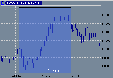 Апрель-май 2003 года. Доллар находился в самой середине тренда ослабления, вызванного структурными проблемами американской экономики. С текущей ситуацией можно найти много общего. Фокус рынка был направлен на дисбалансы мировой экономики (также как и сейчас). Крупные инвесторы проводили диверсификацию резервов, уходя из доллара в евро. Однако в рассматриваемый период времени фокус рынка был всецело захвачен дифференциалом процентных ставок(также как и сейчас) и слухами о девальвации доллара, чтобы повысить конкурентноспособность американских. В мае 2003 года рост евро составил 7 фигур. В текущем году рост евро в период с апреля по июнь составил порядка 9 фигур. Тогда стремительное укрепление европейской валюты не вызывало резонанса в политической среде Европы. В то же время крупнейшие экспортеры региона агрессивно заявляли о негативном влиянии курса евро на их уровень доходов. В то время, также как и сейчас, потребительское доверие в США было довольно высоким.