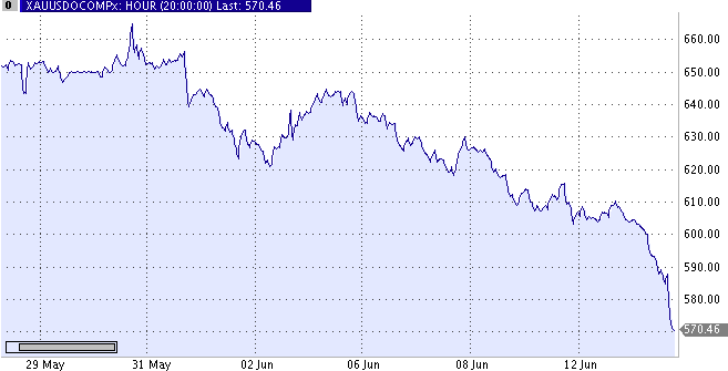 Наличное золото держится на $569.75/унция, в районе минимума дня на $568.30, который был достигнут после того, как британские и европейские игроки закрыли свои леверидж-позиции, тогда как максимум остался далеко на $ 604.30, комментируют ситуацию дилеры. Закаленные рыночные игроки, которые "купили падение" в область $570/$580, предполагают, что пока сохраняется возможность для дальнейшего падения к скользящему среднему значению 200 дней на $ 546. Здесь должна быть оказана большая поддержка с новой волной покупки, вероятно, со стороны долгосрочных игроков. Серебро также было разгромлено сегодня и держится сейчас на $10 за унцию против максимумов дня на $ 10.98.
