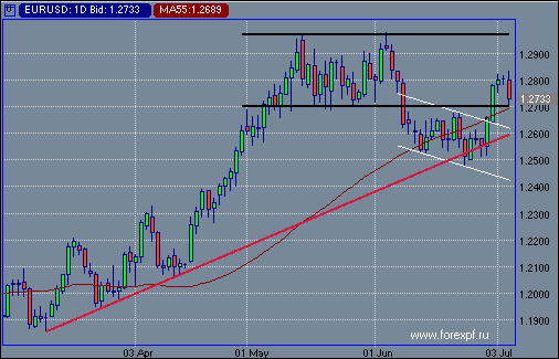 Другими словами, евро/доллар стоит на распутье дорог. Причем это выглядит довольно символично именно перед решением по ставкам ЕЦБ. Участники рынка ожидают повышения ставки на 25 базисных пункта до 3% годовых, но, скорее всего, катализатором движений станет последующая пресс-конференция Жана-Клода Трише и сеанс ответов на вопросы. Рынок надеется на то, что глава ЕЦБ даст надежду на продолжение ужесточения монетарной политики на августовском заседании, однако вряд ли у Трише есть основания проявлять агрессию в летний период, который подразумевает сезонный спад деловой активности и инфляции. Если комментарии Трише, действительно, не будут носить хищный характер, то реакция рынка приведет к росту доллара до 1.2600, что является текущим значением линии тренда, установленного с первого месяца весны. Михаил Шульгин ProFinance.Ru - Forex News / Новости Форекс