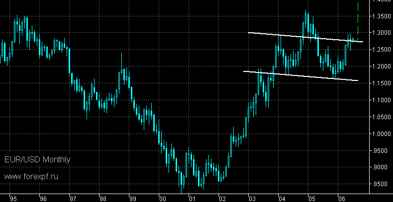 "Перевернутая голова и плечи" (недельный график), прорыв линии шеи которой в апреле вылился в бурное ралли, отработала свой потенциал (цель по высоте модели) вокруг уровня $ 1.30. С тех пор рынок консолидируется в расширяющемся нисходящем канале. Область на графиках евро ниже $ 1.30 стала своего рода перевалочным пунктом не только вследствие отмеченного выше момента, но также и по причине того, что здесь располагалось основание рынка в начале 2005 года, а также по причине того, что медведи пытаются сформировать вершину правого плеча модели "голова и плечи" на месячном графике. Мы, как и раньше, видим небольшой шанс того, что модель будет доведена до логического окончания и сработает (прорыв линии шеи чуть выше $1.15), в том числе из-за очень округлых оснований рынка в середине 2004 года и в конце 2005 -начале 2006, а также в отсутствие рассматриваемой фигуры на линейном графике. Свечной анализ - неудачная попытка сформировать медвежье поглощение в июне и отсутствие разворотных моделей на данный момент, а также тот факт, что мы закрывали май и июнь выше проведенной на графике линии, позволяют делать пока осторожное предположение, что июльская свеча будет белой. Прорыв уровня $ 1.30 внесет ясность в техническую картину. А пока мы предпочитаем ждать. Нас также настораживает рост "непокрытых" шортов по доллару на CME, что создает риски роста доллара на следующей неделе. Дмитрий Полин ProFinance.Ru - Forex News / Новости Форекс