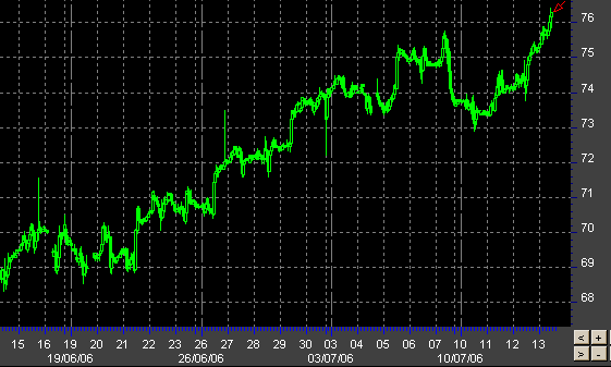 Цены на нефть взяли очередной барьер, на данный момент это - уровень $76 за баррель. Поводов для игры на повышение накопилось много. В их числе - разрушение нефтепровода Agip в Нигерии и обострение ситуации на Ближнем Востоке. Причиной аварии на нефтепроводе в нестабильной Нигерии могли стать два взрыва на нефтепроводе итальянской компании Agip, по которому осуществляется транспортировка нефти на терминал в Брассе. Добыча нефти была сокращена ранее из-за вооруженных атак на нефтепровод, пишет агентство Reuters. Израиль бомбит территорию Ливана и блокирует страну с моря в ответ на атаки исламистской группировки "Хезболлах". Обострение стало самым серьезным за последнее время, и ООН уже направила в регион миссию с целью убедить стороны воздержаться от насилия. Вчера рост цен усилился после выхода данных, показавших, что запасы нефти в США за неделю снизились на 6 миллионов баррелей.
