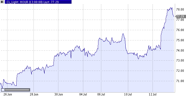 Цены на нефть преодолели очередную планку высоты, превысив уровень в $78 за баррель, на фоне новой волны насилия на Ближнем Востоке и перебоев в поставках из Нигерии, пишет агентство Reuters. Эскалация конфликта между Израилем и Ливаном , а также возобновившиеся опасения по поводу поставок "черного золота" из Нигерии, восьмого по величине в мире экспортера нефти, стали главными причинами роста цен на 1.8 %по сравнению с уровнем закрытия четверга. "С этим напряжением на Ближнем Востоке, никто не хочет останавливать это ралли", - сказал один из дилеров агентству. "Если нефть пробьет уровень $80, кто знает, как далеко она может дойти?" - добавил он. Рост цен облегчается и техническими факторами - закрытием шортов по стоп-лоссам всвязи с выходом к новым рубежам. На рынке сказывается также противостояние Ирана и Запада, вызванное ядерными амбициями Тегерана. Кроме того, Северная Корея отказалась участвовать в переговорах с США, Россией, Японией, Китаем и Южной Кореей, которые озабочены возможностью появления у Пхеньяна ядерного оружия. Как сообщили Reuters представители властей, в Нигерии два взрыва на нефтепроводе, оператором которого является подразделение итальянской Eni Agip, привели к разливу нефти. Eni отрицает сообщения о диверсиях, утверждая, что вскоре нефтепровод будет починен.