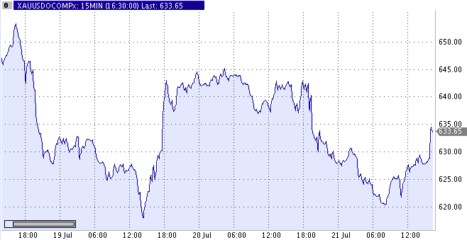 Золото возобновило рост после существенной коррекции в минувшие сессии, в результате которой сегодня был достигнут минимум на уровне $ 620.10 за унцию. После этого произошел резкий отскок котировок на $ 15 вверх на фоне дальнейшего ослабления позиций американского доллара на мировом валютном рынке. Помимо этого, металл остается в спросе в связи с дальнейшей эскалацией военного конфликта между Израилем и Ливаном. "Если вы посмотрите с исторической перспективы на последние пять лет, то золото, действительно, получает поддержку от геополитической напряженности, но позитивное влияние быстро испаряется", - сказал Майкл Льюис из Deutsche Bank в интервью агентству Reuters. "Нам необходимо более убедительное снижение доллара с тем, чтобы золото протестировало уровни выше $700 за унцию", - добавил он. Курс доллара падает после публикации отчета о последнем заседании Федеральной резервной системы, который охладил ожидания роста процентных ставок в США в августе, а также на фоне слухов о новой ревальвации китайского юаня после того как Китай второй раз за месяц поднял резервные требования для коммерческих банков. Израиль продолжил бомбардировки Ливана, а один из израильских генералов сказал, что армия уже в ближайшее время может активизировать наземную операцию в соседней стране и значительно нарастить задействованные в ней силы.
