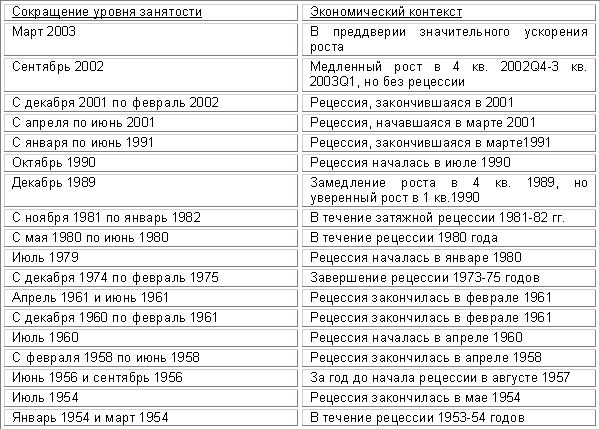 Не последнее слово остается и за таким циклическим индикатором как изменения в уровне занятости по платежным ведомостям в розничном секторе. Совокупное падение этого показателя за последние три месяца составило 0,6%. Исторически, падения такого масштаба совпадали либо с рецессией в экономике, либо с началом выхода экономики из рецессии (см. таблицу ниже). Это не опережающий индикатор. Учитывая то, что экономика совершенно точно не находилась в состоянии рецессии в период с апреля по июнь, информативная ценность недавнего ослабления можно поставить под вопрос.