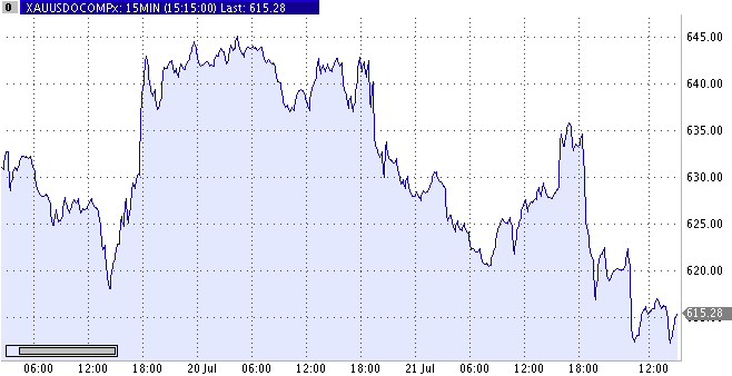 Цены на золото достигли в понедельник трехнедельного минимума на фоне неожиданного и резкого роста курса доллара к основным валютам, пишет агентство Reuters. "Люди все еще нервничают из-за негативной динамики цен на золото", - говорит сказал Саймон Уикс из ScotiaMocatta. "Если мы провисим здесь пару дней, то я бы ожидал небольшого спроса и прихода охотников за дешевыми активами. Но сейчас все относительно спокойно", - добавил он. Золото снизилось на 1.3 % процента до $611.50 за унцию, что стало для него минимальным значением с 30 июня, но к 15.15 мск оно поднялось до $614.85. В в пятницу металл закрылся на уровне $619.50/621.00, снизившись за сессию почти на 2.0 %. "Инвесторы, судя по всему, отметают политические риски, связанные событиями на Ближнем Востоке. Цены на нефть не смогли отреагировать на бои в Ливане, и поэтому и у золота нет причин для роста", - пояснил Джеймс Стил из HSBC. В воскресенье госсекретарь США Кондолиза Райс призвала к немедленному перемирию между Израилем и "Хезболлах", однако в понедельник лидер группировки заявил о продолжении ракетных обстрелов территории еврейского государства. Доллар вырос из-за опасений инвесторов по поводу того, что продажи американской валюты на прошлой неделе были излишне большими, пишет агентство.