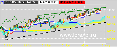 КОММЕНТАРИЙ: вчера кросс установил новый семилетний максимум Y148.07, вблизи которого проходит линия сопротивления с 19 апреля. Эта линия пока хорошо ограничивает восходящий потенциал евро/йены и повышается на графике со скоростью 3 п./день. Прорыв курса ниже уровня Y147.60 указывает на риски снижения цены к 21-дневной скользящей средней, которая вчера сдерживала нисходящее движение пары.