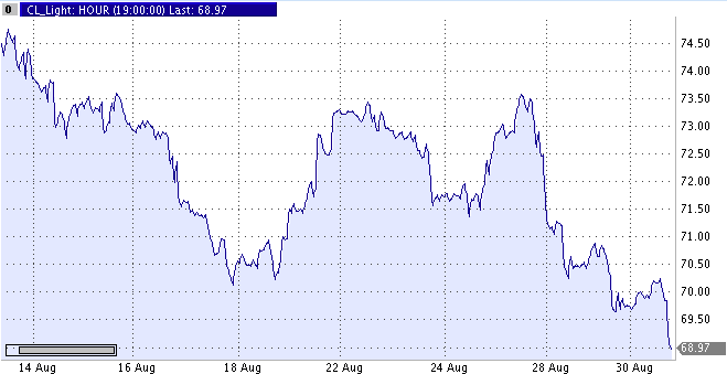 Как сообщило Управление энергетической информации США, запасы нефти за неделю на 25 августа 2006 года выросли на 2.4 баррелей до 332.8 миллиона баррелей, бензина - на 0.4 миллиона баррелей до 206.2 миллиона баррелей, дистиллятов - на 1.3 миллиона баррелей до 136.8 миллиона баррелей, а печного топлива - на 0.3 миллиона баррелей до 58.9 миллиона баррелей. Аналитики, опрошенные агентством Reuters, ожидали, что запасы нефти за неделю снизятся на 1.5 миллиона баррелей, бензина - на 0.7 миллиона баррелей, дистиллятов и печного топлива - вырастут на 1.3 миллиона баррелей. По данным API, запасы нефти выросли на 3.5 миллиона баррелей до 337.1 миллиона баррелей, запасы бензина - на 0.8 миллиона баррелей до 208.9 миллиона баррелей, запасы дистиллятов - на 1.7 миллиона баррелей до 136.0 миллиона баррелей. После выхода данных цены на нефть резко пошли вниз и пробили уровень поддержки на $ 69.50 за баррель, однако смогли ненадолго отскочить от более сильной поддержки на $ 69.00 за баррель, которую пробили позднее, установив новый минимум на $ 69.00 за баррель $ 68.85 за баррель. Вчера цены впервые более чем за два месяца закрылись ниже психологически важной поддержки в $ 70.00 за баррель, что стало негативным сигналом для рынка, усилившим медвежье давление. Теперь все внимание инвесторов направлено на область сильной технической поддержки $ 68.00/69.00. Ее прорыв может привести к камнеобразному падению цен в район $ 60 за баррель.